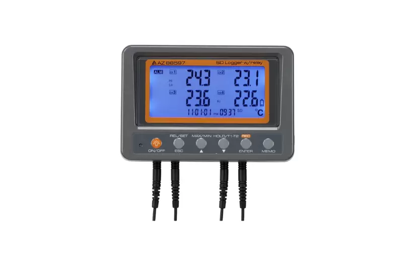 Applicazione del termometro 88599 AZ a 4 canali con termocoppia K e termistore, con scheda SD e relè:il registratore di temperatura 88599 AZ può misurare e monitorare la temperatura da 4 diverse sorgenti, inclusi 2 canali per termocoppia K e 2 canali per termistore. L'utente può utilizzare l'alimentazione a 9 V CC e la sua funzione di montaggio a parete per registrazioni di lunga durata, oppure 4 batterie AA per un comodo monitoraggio/registrazione. Il valore della temperatura viene salvato in formato TXT sulla scheda SD, per poi procedere con l'analisi successiva tramite Excel o altri software. Può essere utilizzato facilmente su diversi sistemi operativi per PC. La scheda SD può essere inserita e rimossa facilmente.Il termometro 88599 AZ a 4 canali con scheda SD, termocoppia K e termistore ha un ampio display LCD che può essere utilizzato per il monitoraggio e la registrazione della temperatura in settori quali edilizia, logistica e altri settori. Dispone inoltre di una funzione di retroilluminazione, che consente all'utente di utilizzare facilmente il data logger in aree buie.Il misuratore di termocoppia K a 4 canali e registratore dati per termistori con scheda SD 88599 AZ ha la funzione relè, che può trasferire il segnale di temperatura ad altre apparecchiature (ad esempio: allarme GSM) o controllare i seguenti strumenti